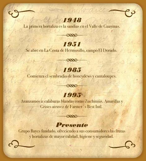 A mediados de la década de los 70’s, Alejo Bay Rogel, con una plena vocación agrícola y dedicación empezó a sembrar honeydews y cantaloupes, y fue en 1985 cuando, con mucha visión, se inició el cultivo de Calabaza Kabocha a través de Omega Produce. En 1995 se empezó a sembrar calabazas blandas como Zuchinnis, Amarillas y Grises a través de Farmers´ Best Intl. De ahí, se fueron afinando las fechas de siembra, así como las variedades, para obtener un día como hoy las calidades que Grupo Bay ofrece a sus consumidores.